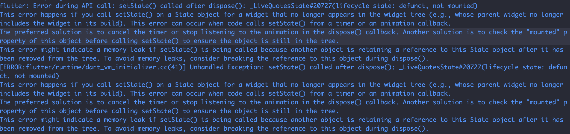setState() is being triggered from a Timer or animation callback even after the widget has been removed from the widget tree.
