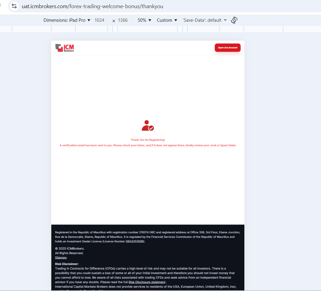 closedICM BROKERS WEBSITE MAURITIUS - On the tab screen, the success message page has unnecessary blank space